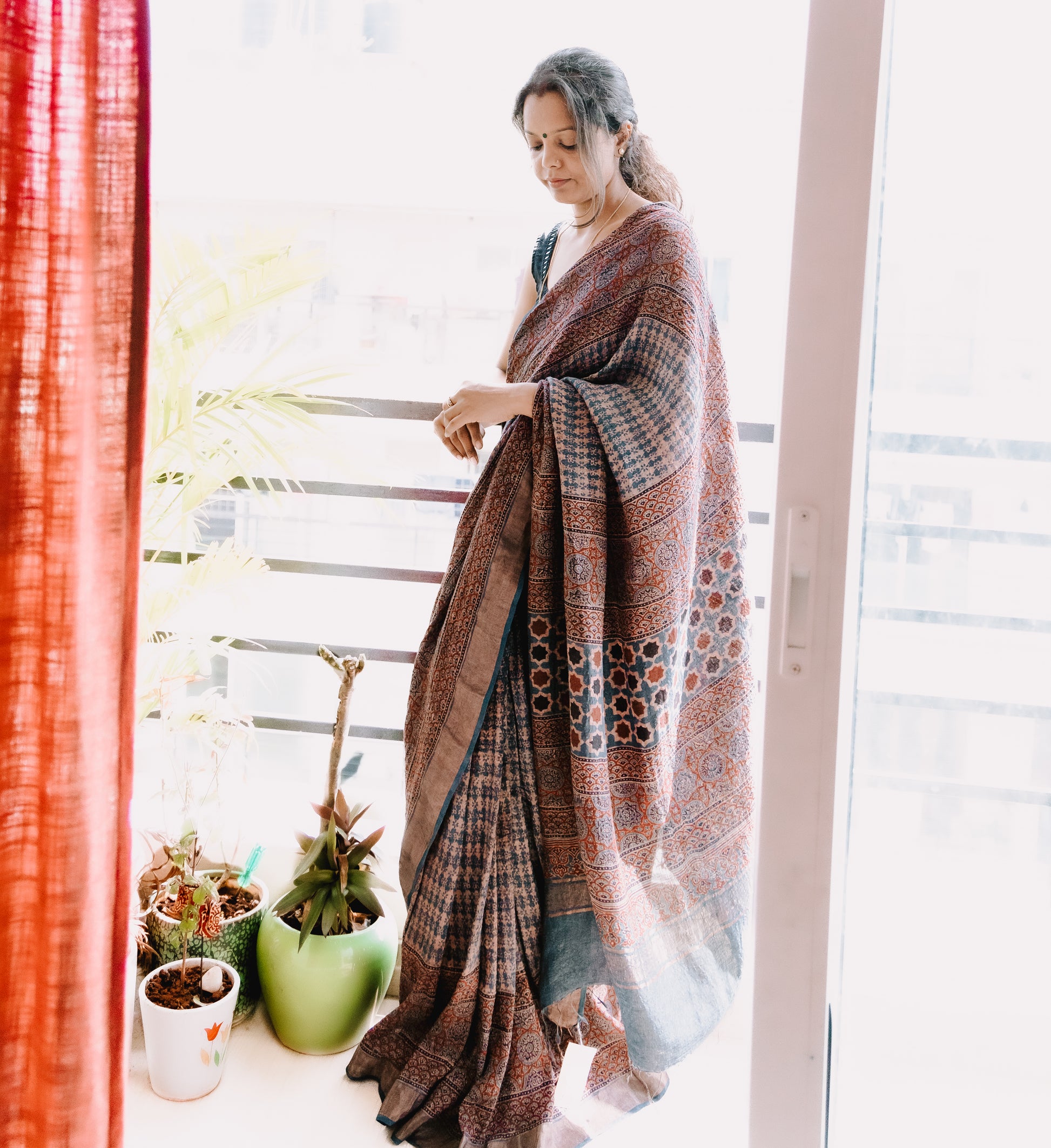 Blouse - Saree comes with its own blouse piece in Ajrakh Print .
