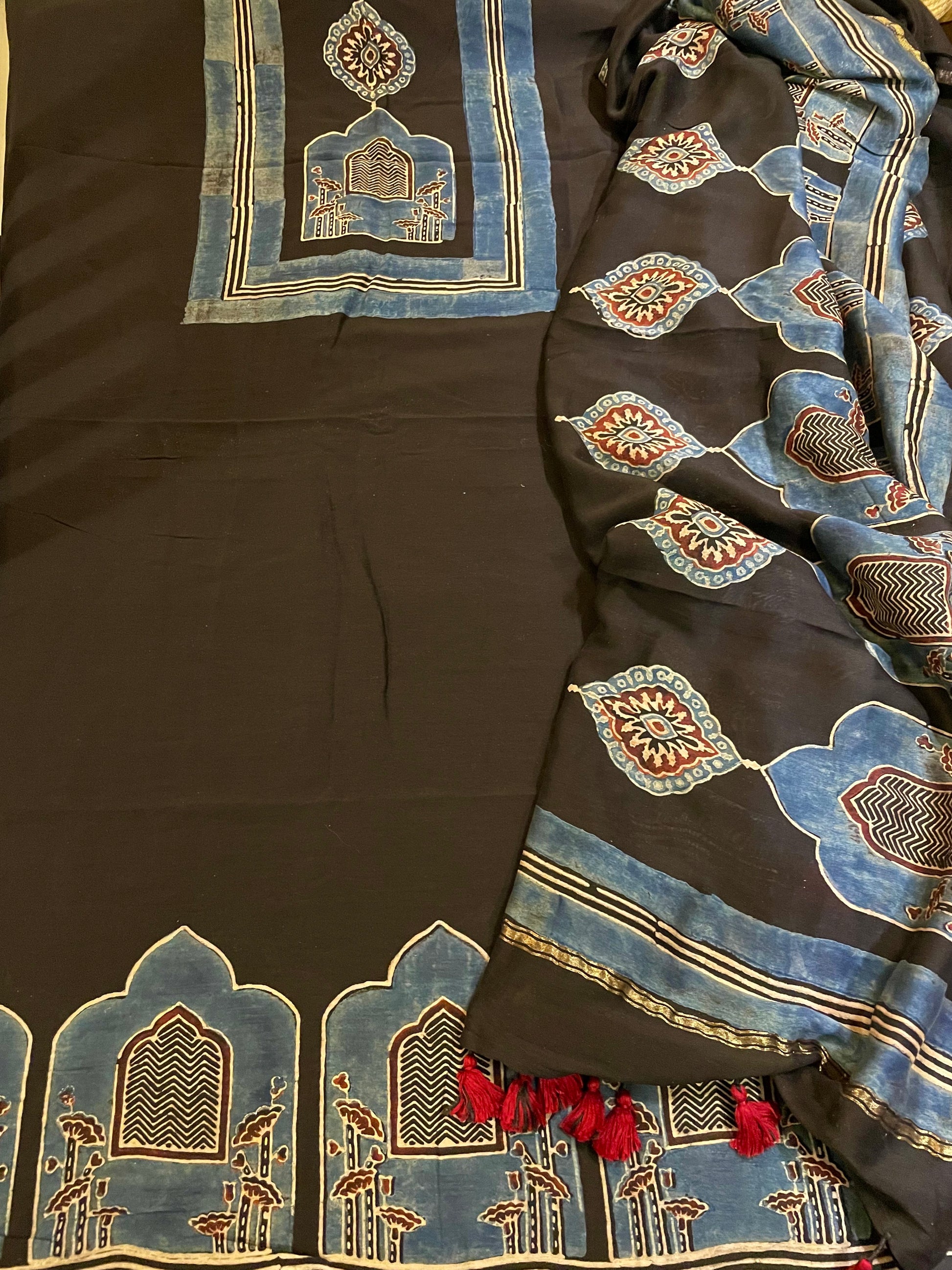 AJRAKH CHANDERI SILK HANDBLOCK SUIT SET(Black)