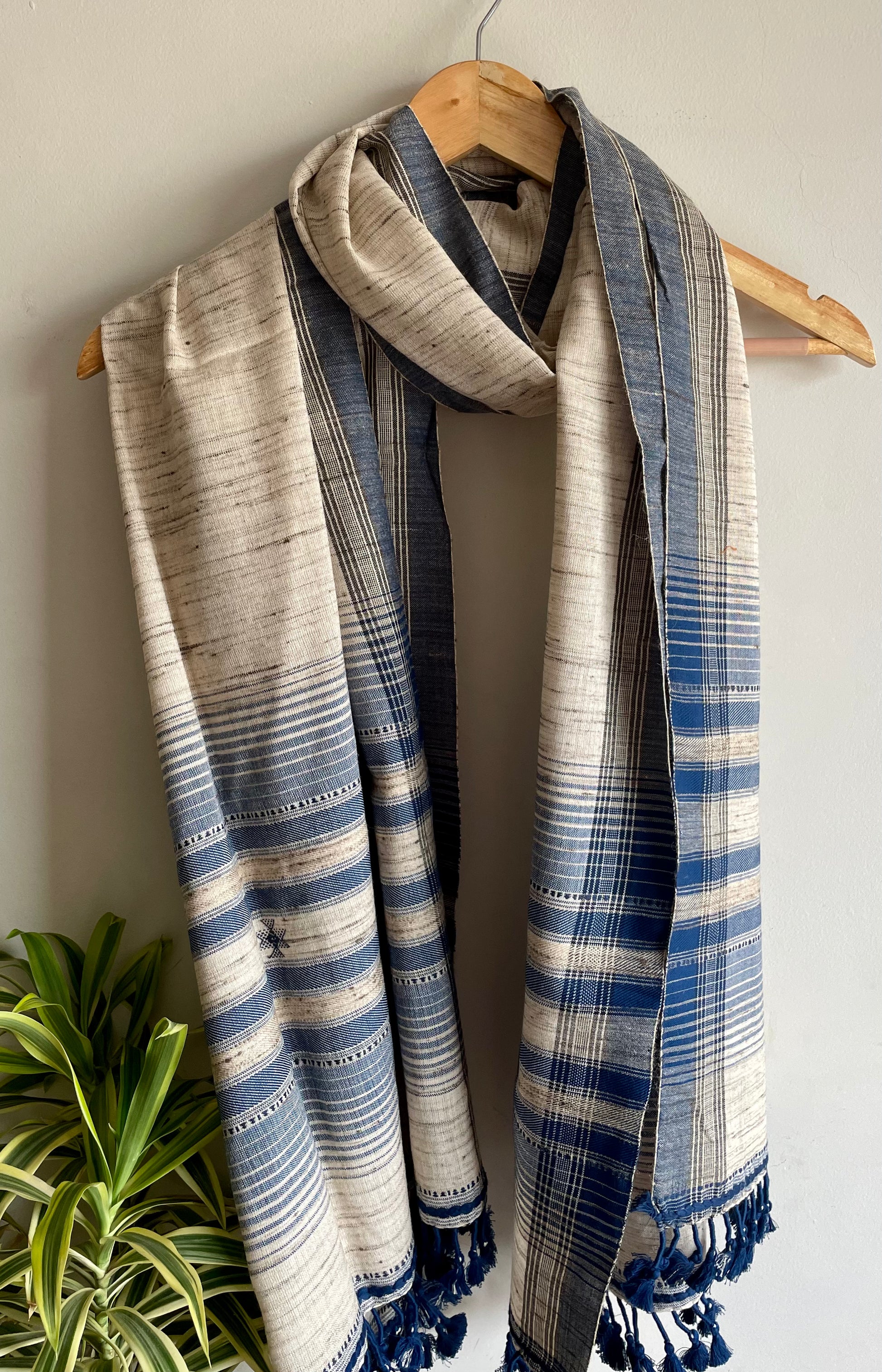 This Signature Bhujodi Stole, made with a combination of Tussar and Merino Wool. This stole is made with natural dyes by master Bhujodi Weaver Vankar Shamji Vishram Valji made. Wrap yourself with such valuable piece of Kutchi heritage.