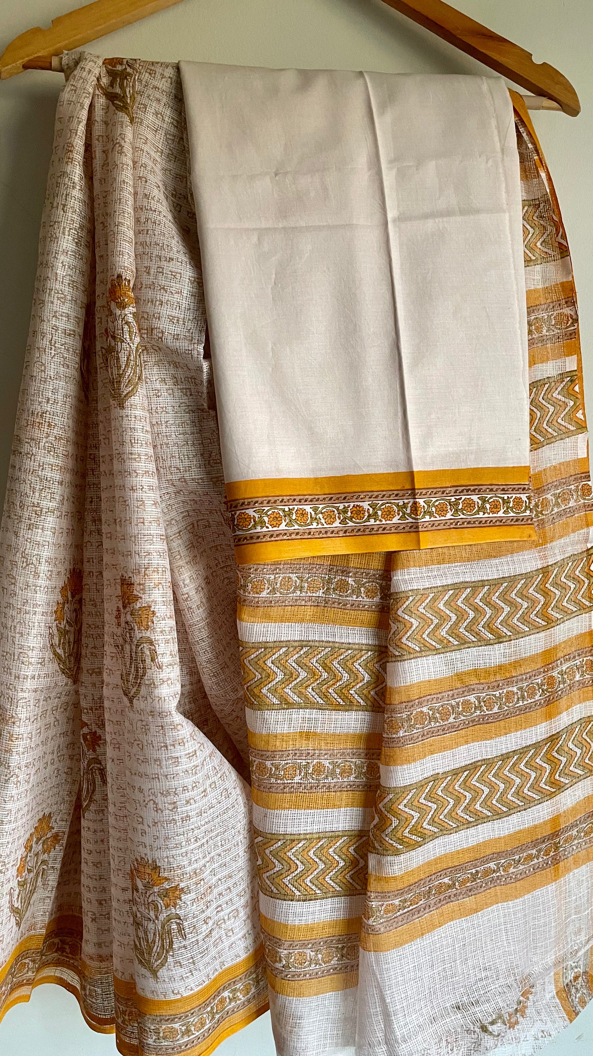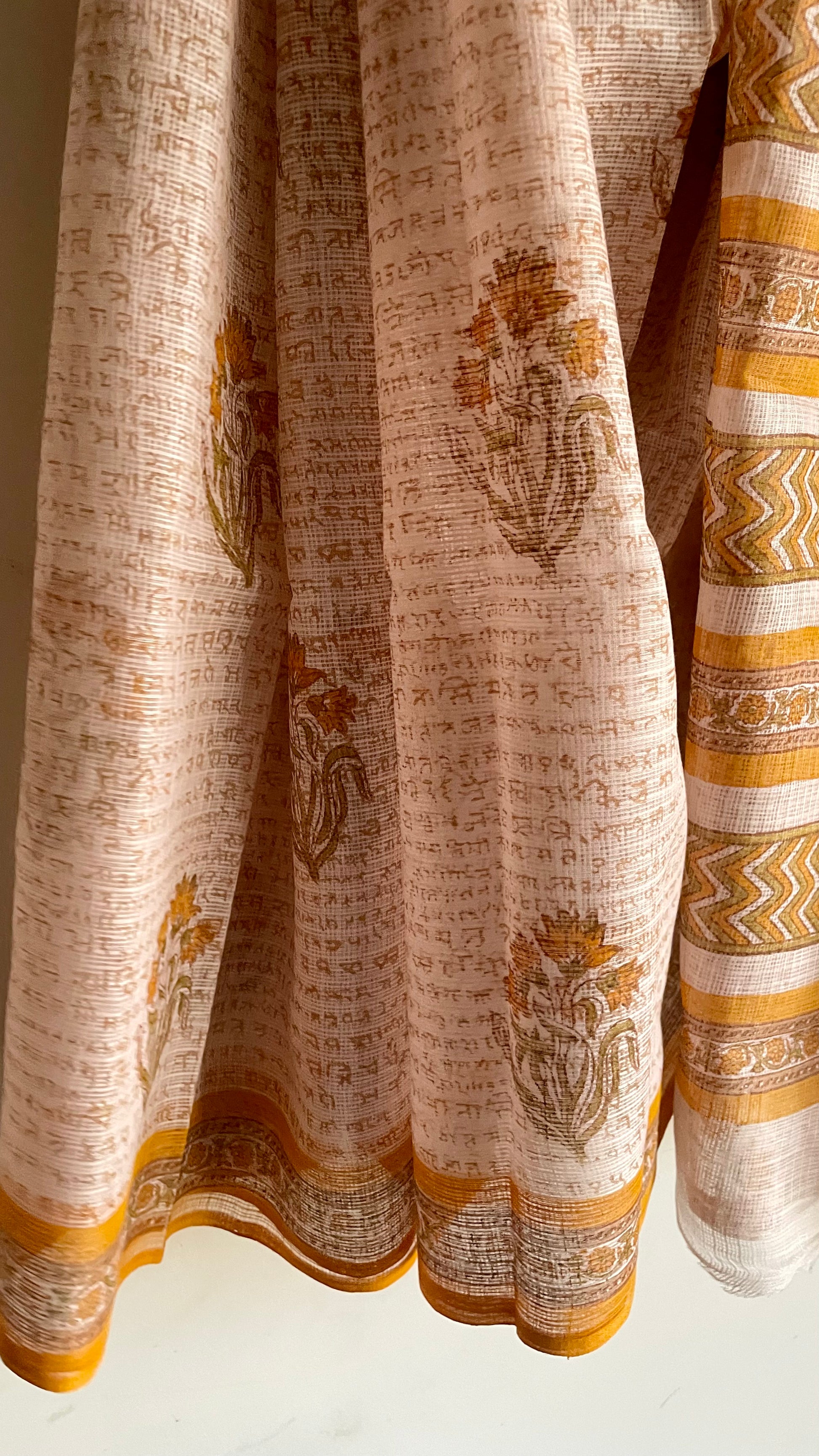Product Details: Floral Hand block printed handloom Kota Doria cotton saree