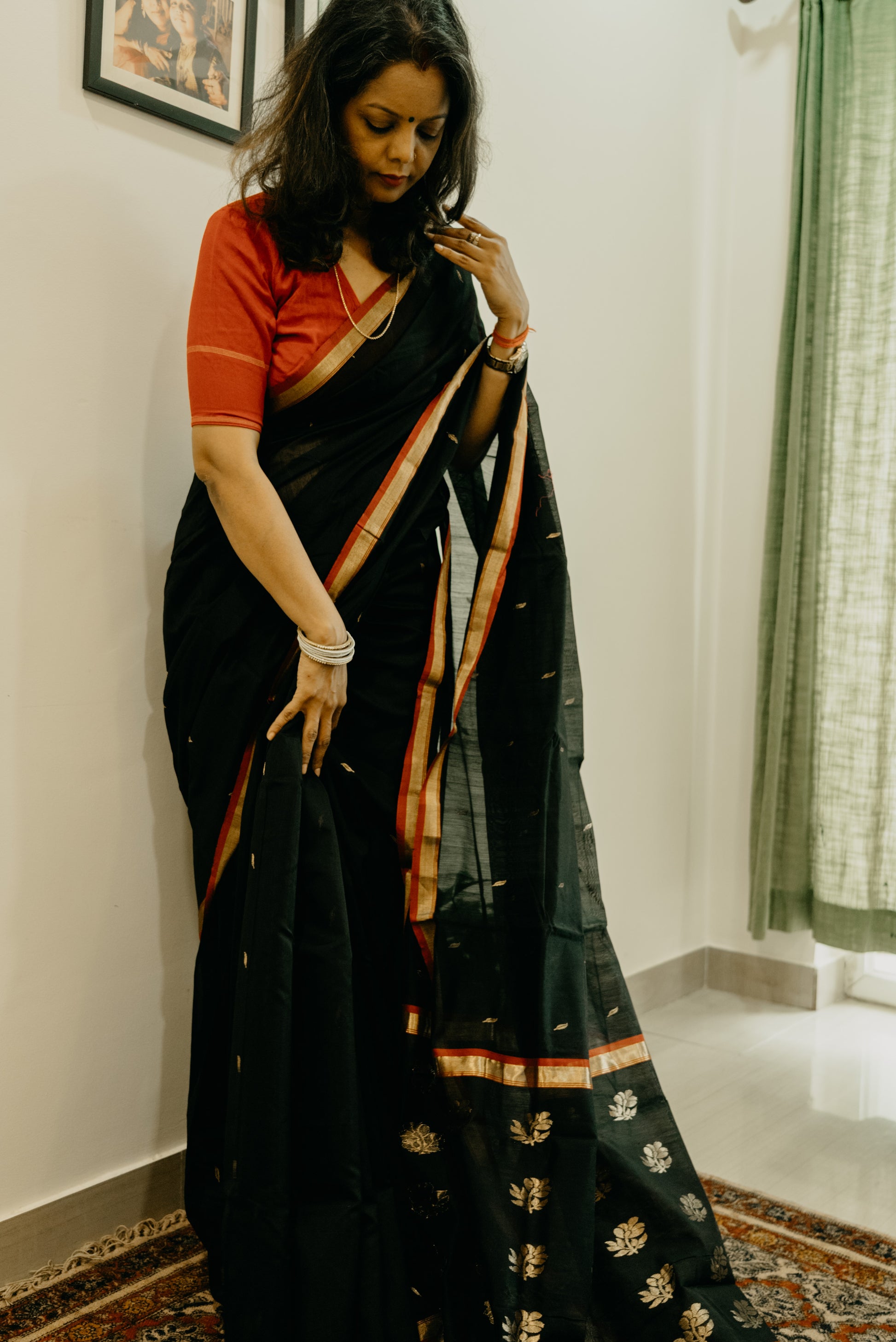 This black chanderi saree is handwoven by skilled artisans in Chanderi, Madhya Pradesh. Made using a fine silk–cotton blend, it features delicately woven buttis created with separate needles, showcasing precision and traditional technique. The subtle sheen and zari border add an elegant, regal finish, making it a beautiful choice for festive events, weddings, and special gatherings.