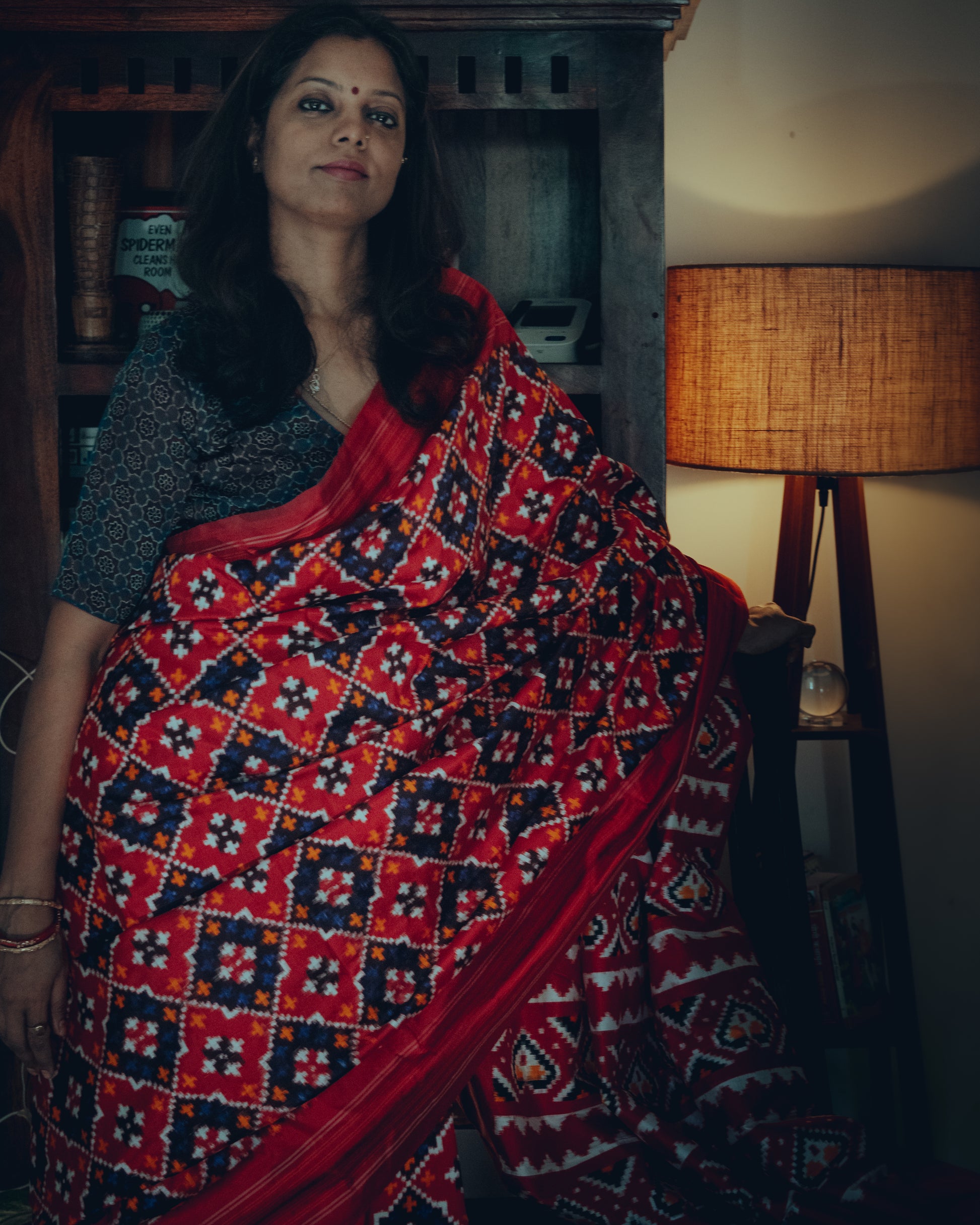 Product Description: This Pochampally silk Double Ikkat Saree has a unique Ambali pattern. The elegant weave comes with red edge border. The strikingly pretty Red pallu lends a gorgeous complement. The red ikat blouse adds oodles of panache!