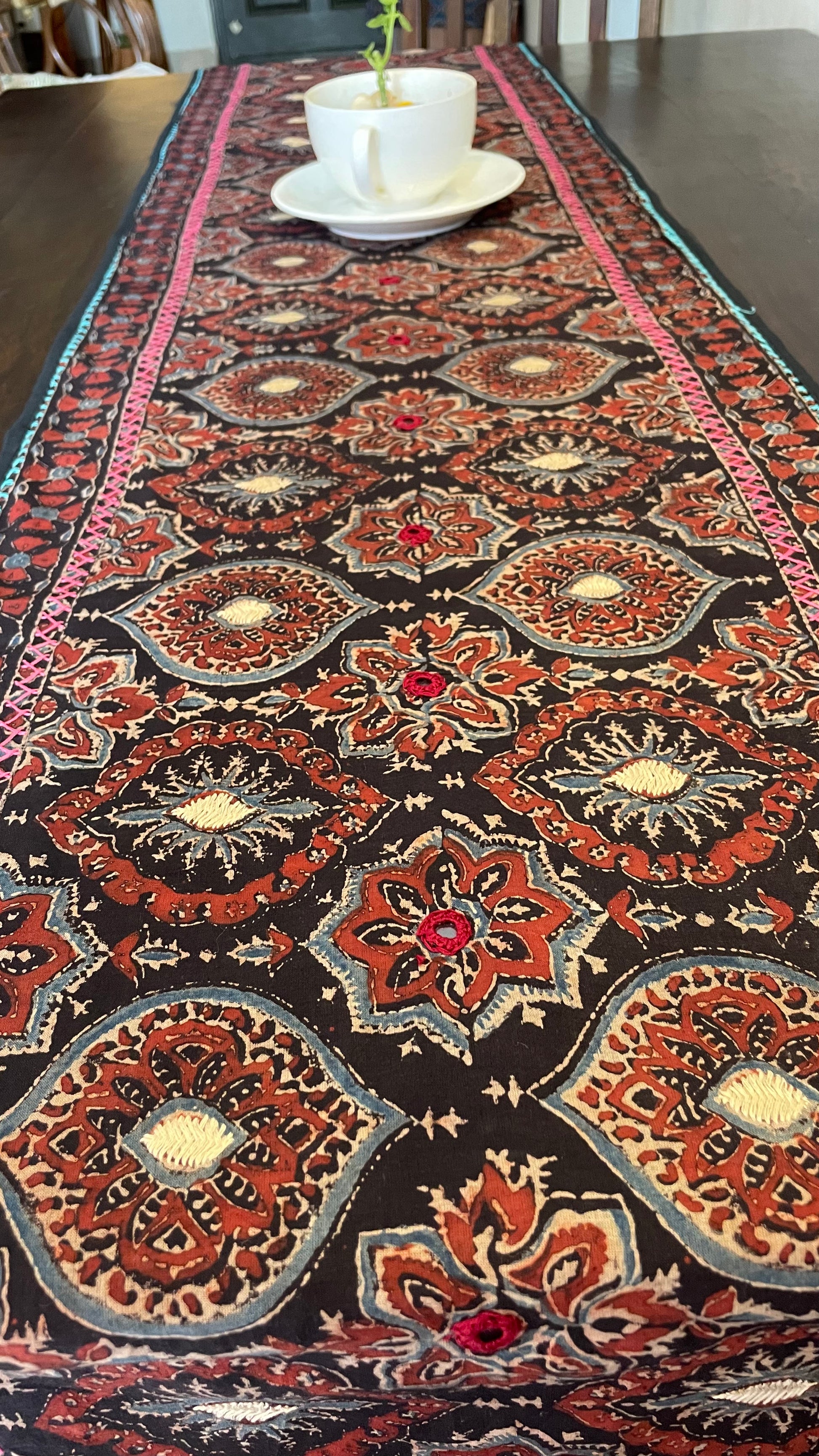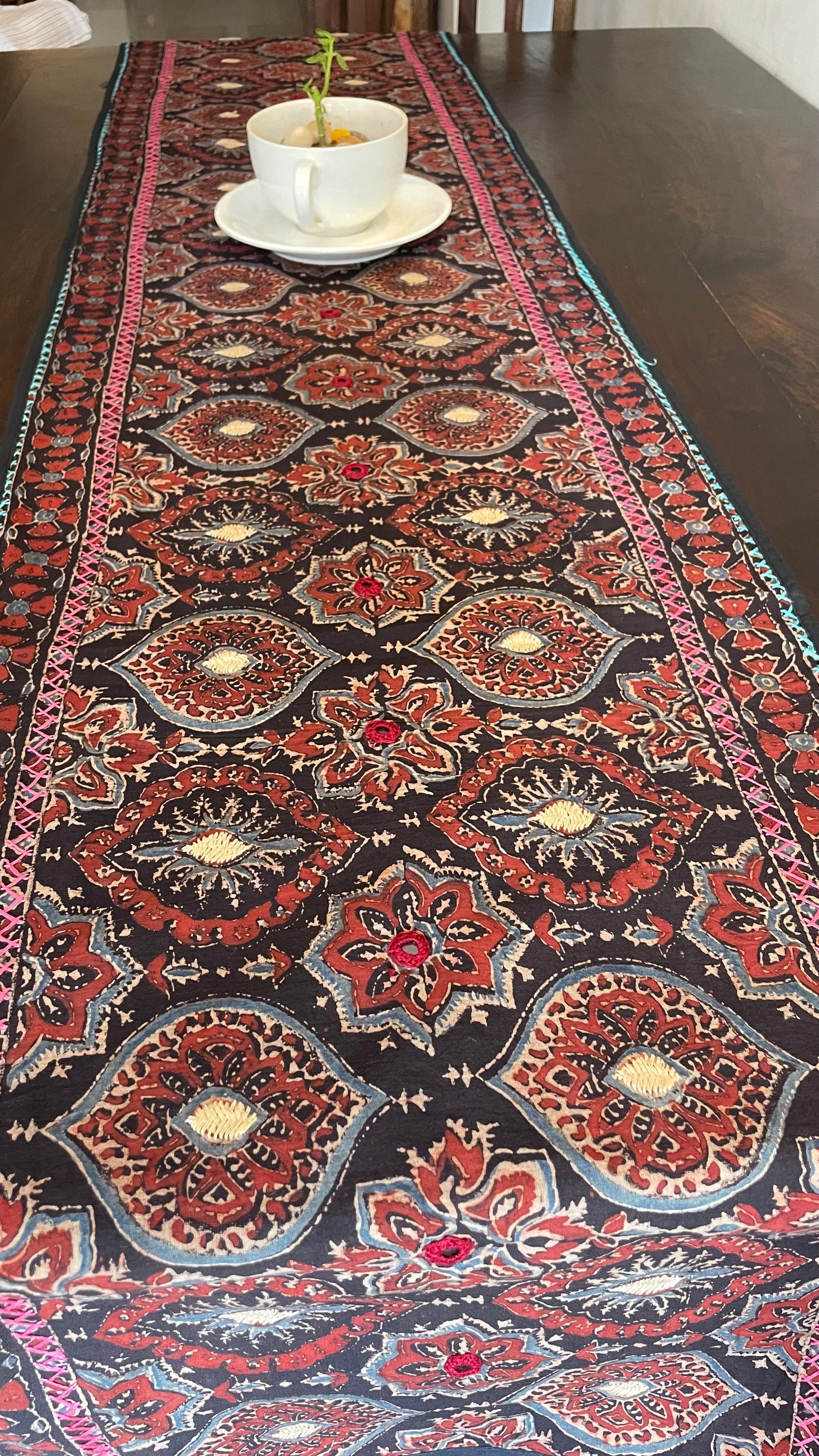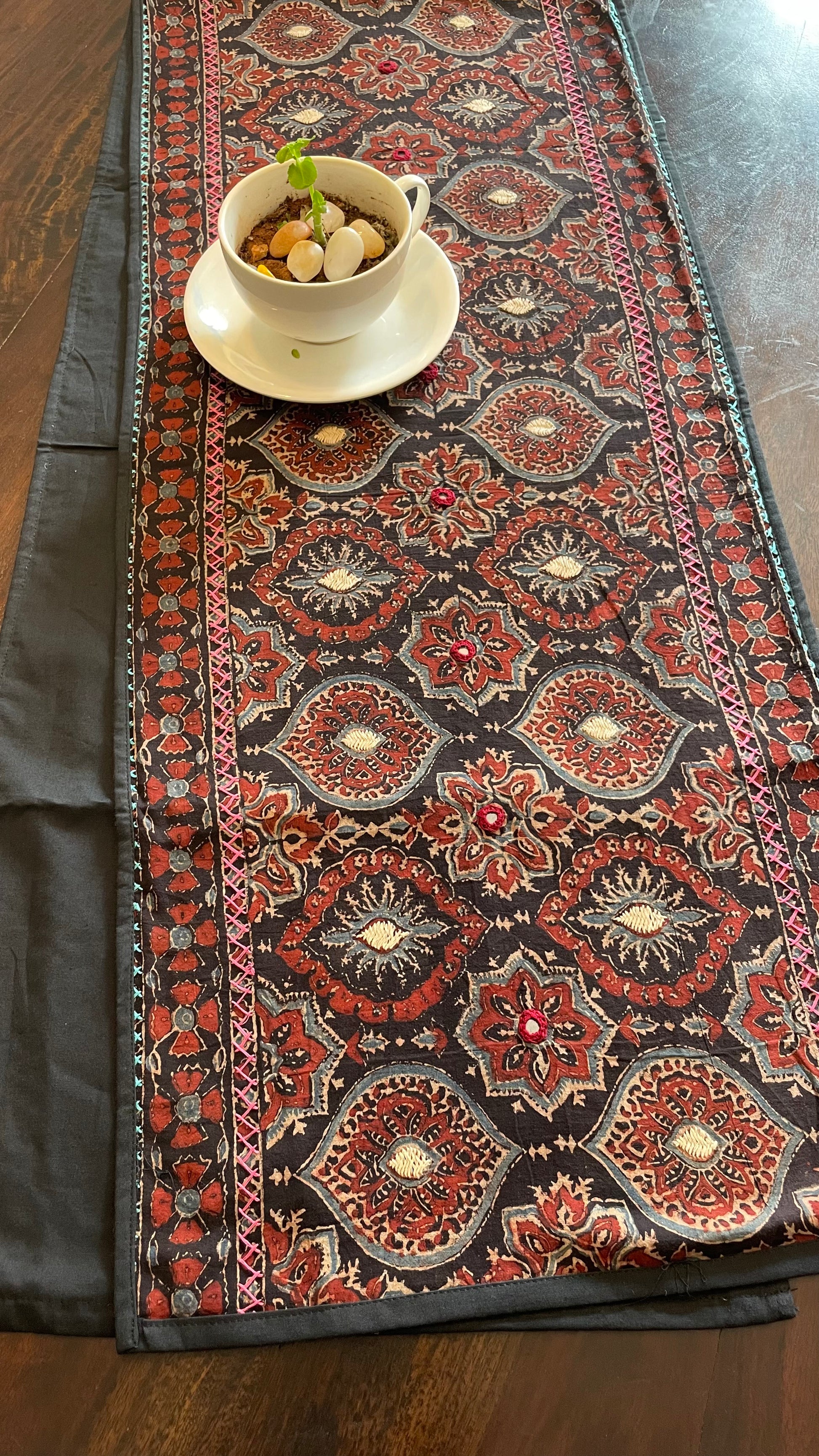 AJRAKH BLOCK PRINTED HAND EMBROIDERED COTTON TABLE RUNNER.