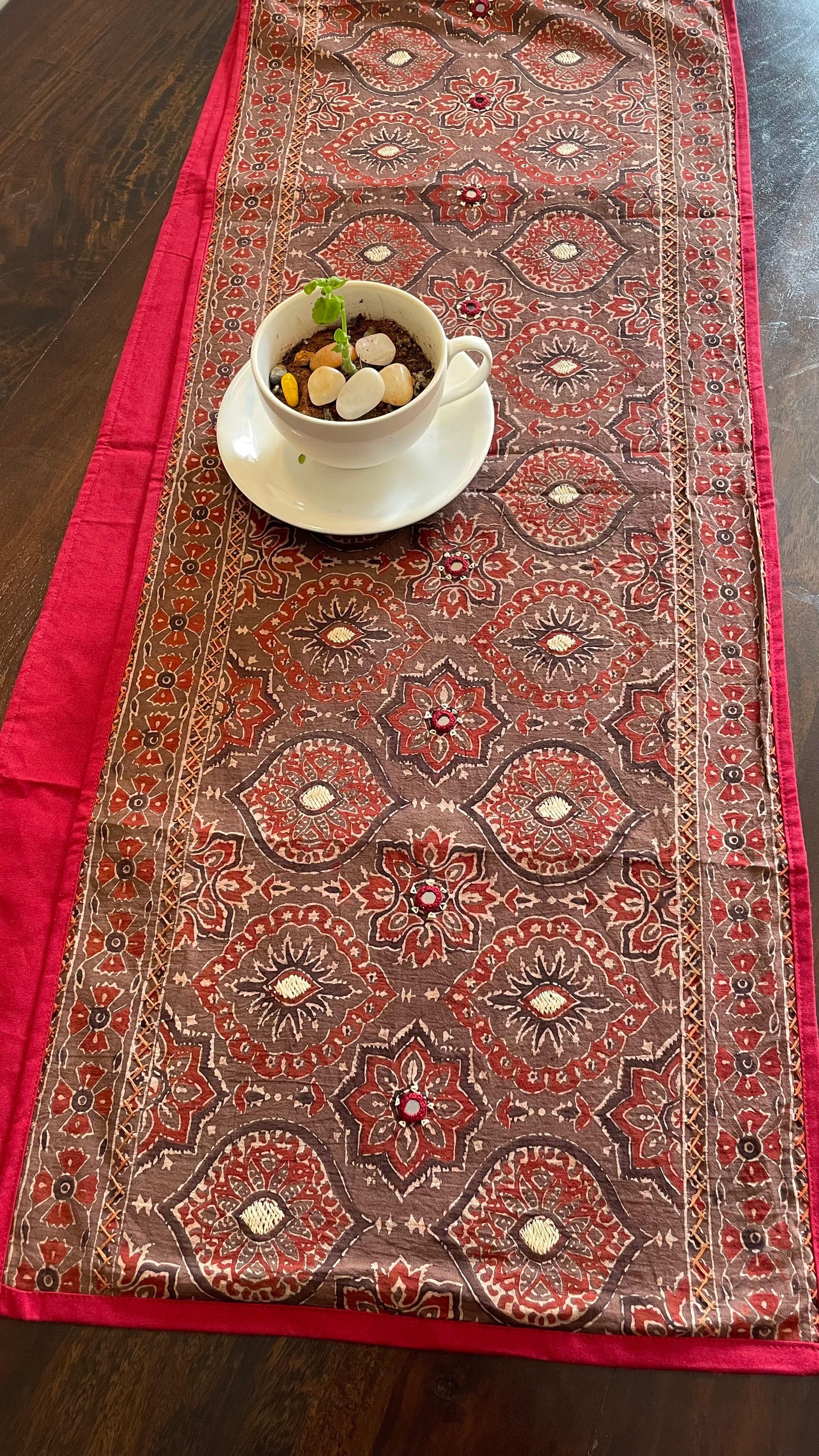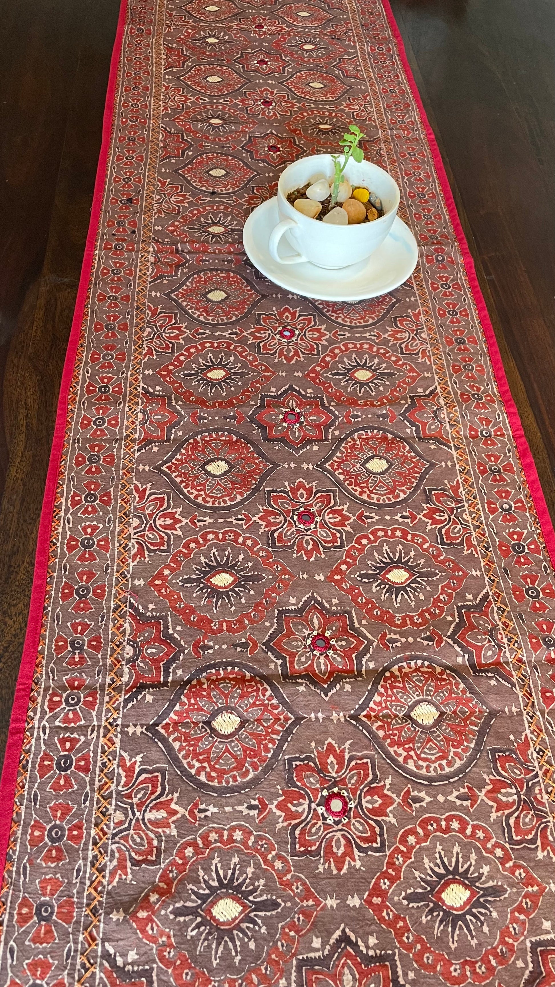 AJRAKH BLOCK PRINTED HAND EMBROIDERED COTTON TABLE RUNNER.