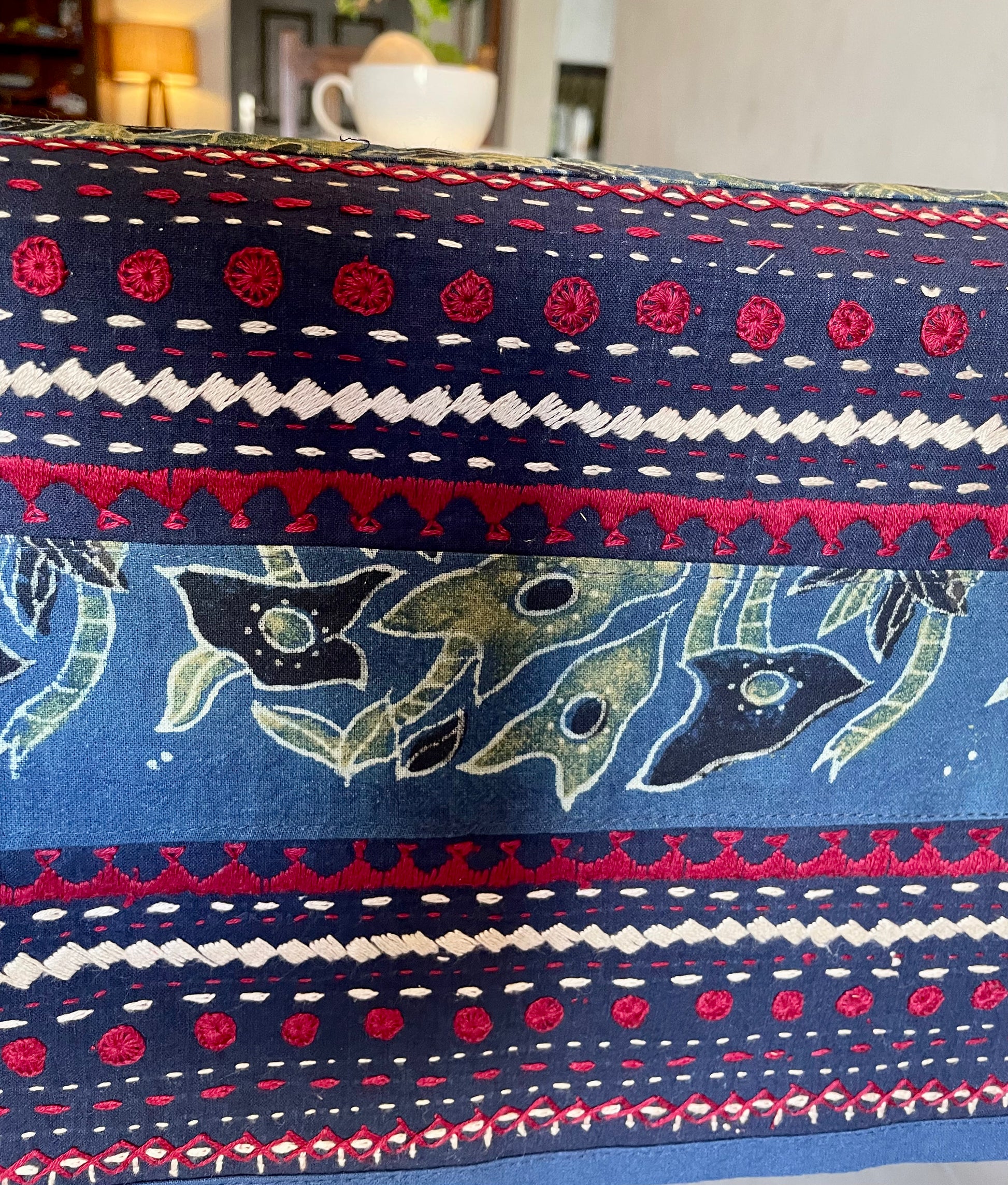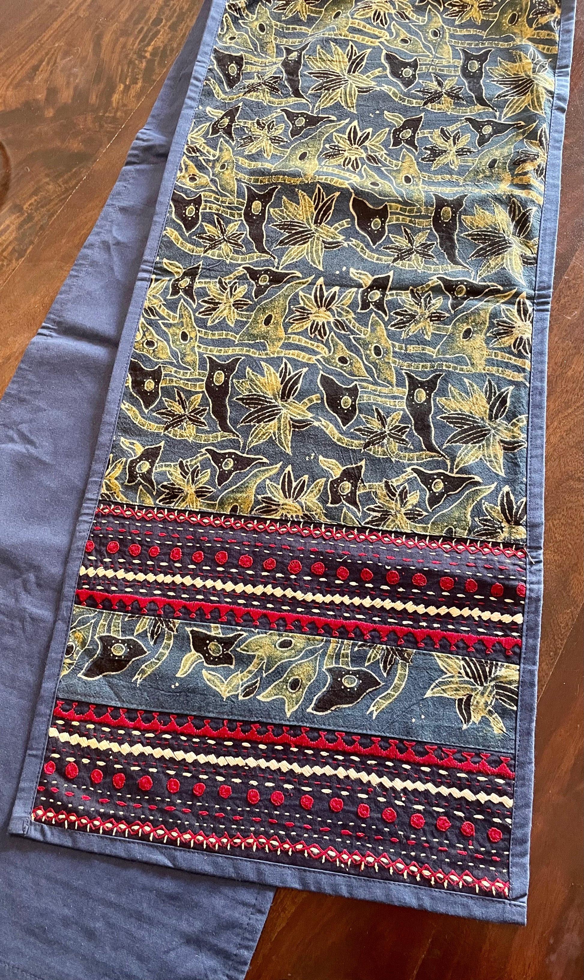 AJRAKH BLOCK PRINTED HAND EMBROIDERED COTTON TABLE RUNNER.