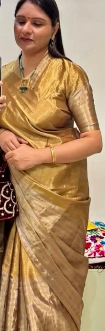 Handwoven Metallic Tissue chanderi silk saree , Tissue sheer saree is a festive stunner. This tissue silver and gold saree is a head-turner. With it, pair some statement jewellery and be the life of the party.